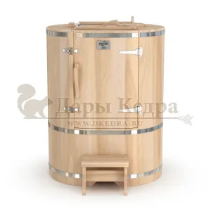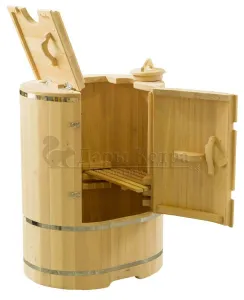 Овальная фитобочка из кедра - это мини парная, которую можно использовать не только в спа-салонах, но и дома. Овальная модель более просторна и удобна в использовании. Толщина стенок составляет 25 мм. Она оборудована откидными створками, дверцей и отверстием для головы. Во время парения человек сидит внутри кедровой бочки, а голова находится снаружи. Благодаря этому исключается возможность перегрева. Подлокотники из кедра, встроенные ручки на створках и двери делают эксплуатацию более удобной.