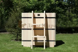 Это квадратная емкость для воды из кедра. Она предназначена для отдыха и охлаждения тела после банных процедур. Благодаря своей форме купель хорошо впишется в угол помещения, так же ее можно установить на улице. Квадратная купель оснащена лавочками, приставной и внутренней лестницей из кедра. За счет стяжных болтов обручи из нержавеющей стали плотно прилегают к кедровой купели. Это позволяет равномерно распределять нагрузку воды и сохранить форму изделия в период эксплуатации. При правильном уходе купель для бани не рассыхается и не подвергается гниению.