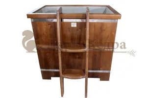 Это емкость для воды с прямоугольной пластиковой чашей. Купель предназначена для отдыха и охлаждения тела после процедур парения. Подходит для уличного и комнатного использования. Для удобства пользования овальная купель с пластиковой вставкой оснащена лавочками, приставной и внутренней лестницей из кедра.
